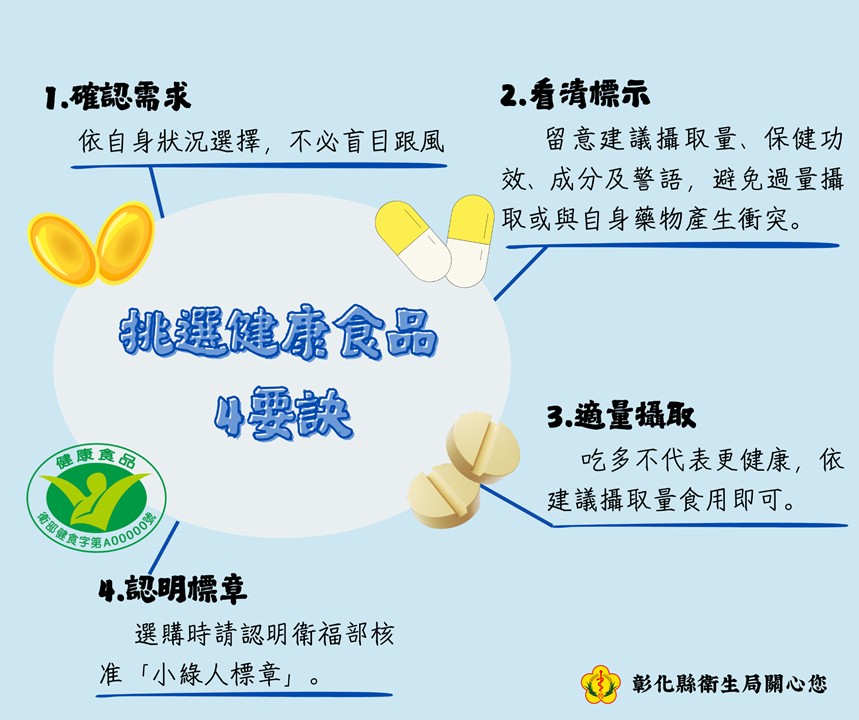 提醒民眾於選購健康食品時,應掌握以下原則: