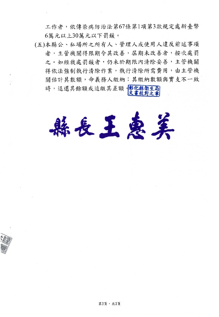彰化縣已於今(115)年3月31日公告「彰化縣預防登革熱、屈公病及茲卡病毒感染症之孳生源清除等防疫措施」,請公、私場所之所有人、管理人或使用人主動清除所屬場域及住家室內外之積水容器等孳生源,避免病媒蚊孳生。如未主動妥善管理、清除積水容器及積水處,導致孳生病媒蚊幼蟲(孑孓)者,依傳染病防治法第70條規定處新臺幣3千元以上1萬5千元以下罰鍰。