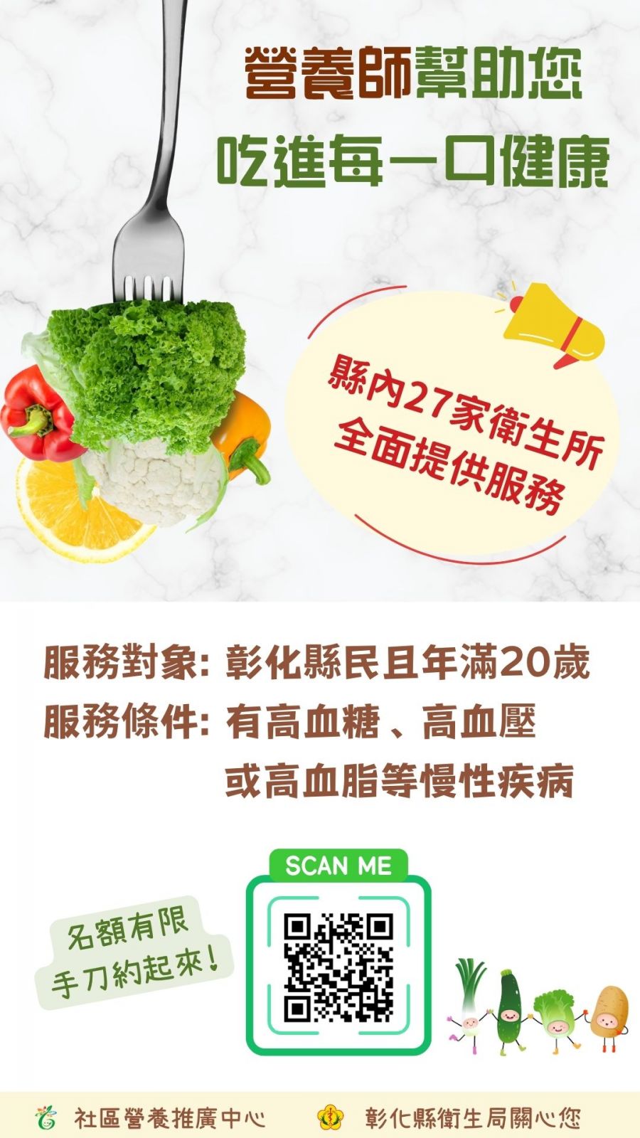 縣內27家衛生所全面提供本項服務,服務對象為年滿20歲之彰化縣民,且經診斷有高血糖、高血壓或高血脂等慢性疾病者。民眾可依自身需求,選擇鄰近衛生所預約諮詢,讓營養照護更便利、可近性更高,打造在地化的健康支持網絡。